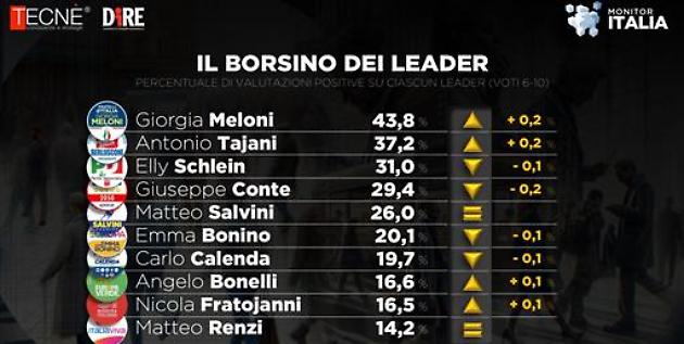 Giorgia Meloni ancora al primo posto tra i leader di partito nel gradimento degli italiani. Antonio Tajani guadagna il secondo posto. Terza la segretaria dem, Elly Schlein. Quarto e quinto rispettivamente Giuseppe Conte e Matteo Salvini