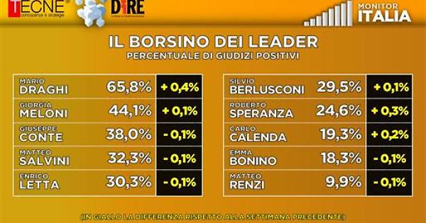 Mario Draghi è saldamente il leader politico più apprezzato dagli italiani e anche questa settimana aumenta il proprio consenso. Bene anche Giorgia Meloni, seconda in questa graduatoria mentre Giuseppe Conte, terzo, continua a scendere. E' quanto emerge da Monitor Italia, il sondaggio realizzato da Tecnè con Agenzia Dire, con interviste effettuate il 23 luglio su un campione di mille casi. Draghi è primo col 65,8%, +0,4% rispetto all'ultima rilevazione di sette giorni fa. Quindi Meloni col 44,1% (+0,1) e Conte col 38% (-0,1%). Piccole modifiche sotto al podio: Salvini 32,3% (-0,1%), Letta 30,3% (-0,1%), Berlusconi al 29,5% (+0,1%), Speranza 24,6% (+0,3%), Calenda 19,3% (+0,2%), Bonino 18,3% (-0,1%), Renzi 9,9% (-0,1%).