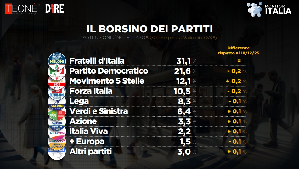 Fratelli d'Italia si conferma il primo partito italiano, calano i consensi di Pd e Forza Italia e al contrario sale quello del Movimento 5 stelle. E' quanto emerge dal sondaggio realizzato da Tecnè per l'agenzia Dire con interviste effettuate tra il 7 e l'8 gennaio. Fratelli d'Italia resta in testa col 31,1%, invariato rispetto all'ultima rilevazione del 18 dicembre. Segue il Pd al 21,6% (+0,2); poi M5S all'12,1% (+0,2); Forza Italia al 10,5% (-0,2); Lega all'8,3% (-0,1). Poi Avs al 6,4% (+0,1); Azione al 3,3% (+0,1); Italia Viva al 2,2% (+0,1) e infine +Europa all'1,5% (+0,1%)
